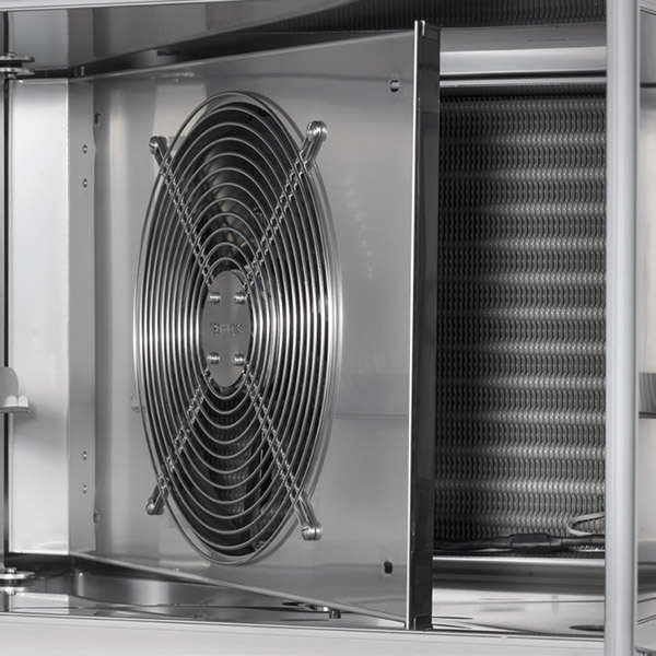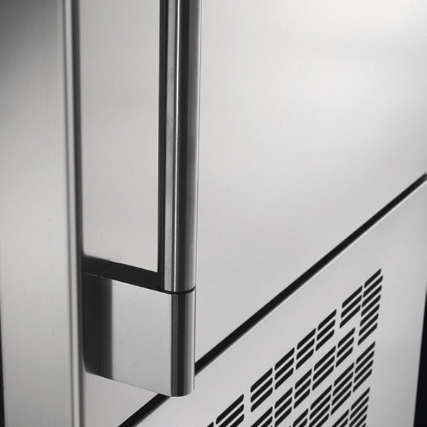 Tillverkad i rostfritt stål AISI 304 både invändigt och utvändigt, godkänt för livsmedelskontakt. Utformad för enkel rengöring med rundade hörn och en öppningsbar frontpanel. Luftcirkulation med indirekt luftflöde för skonsam och jämn kylning av produkterna.