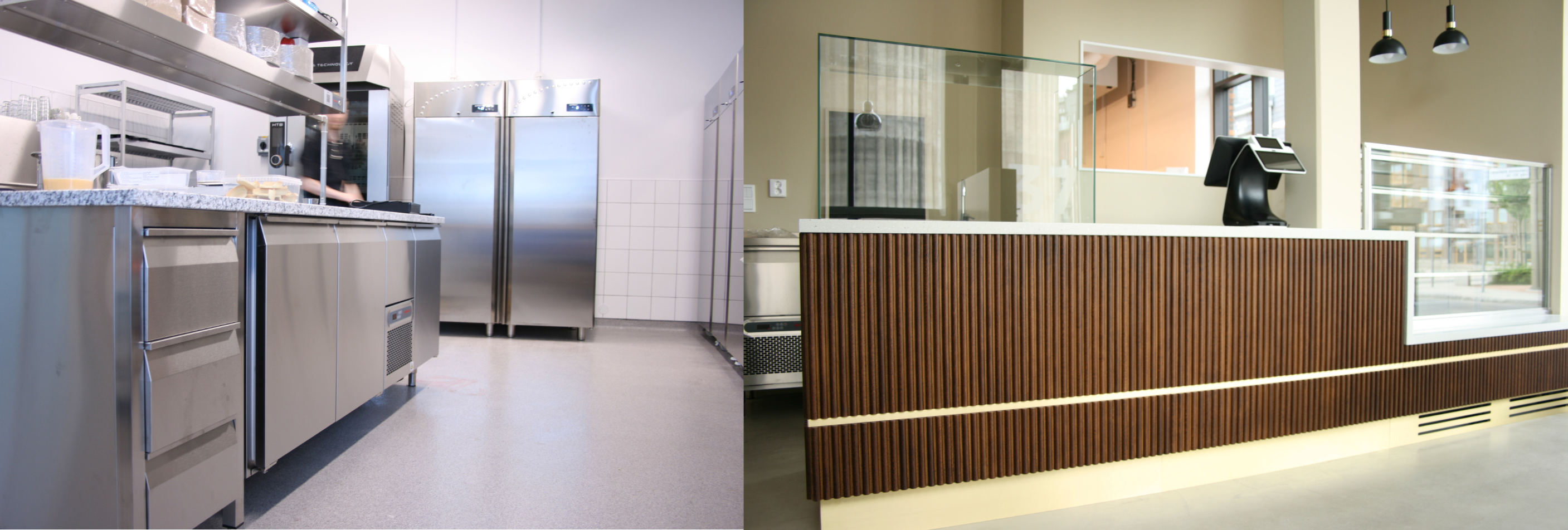 Genom smart planering, tydliga zoner och öppna siktlinjer skapades ett effektivt arbetsflöde där allt finns nära till hands utan att kännas trångt. I produktionsköket placerades en specialritad köksö som fungerar som bageriets hjärta – en central arbetsyta som samlar funktionerna och förenklar det dagliga arbetet.