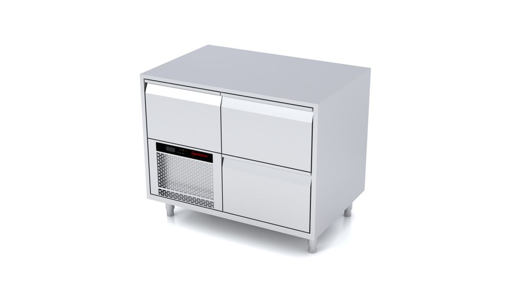 Ett fläktkylt kylsystem ger snabb nedkylning och jämn temperatur i alla lådor. Temperaturen styrs via en digital termostat och hålls stabilt mellan –5…+8 °C, även när lådorna öppnas ofta under service. Modellerna är energieffektiva i energiklass A, med upp till 45 % lägre energiförbrukning än traditionella barkylbänkar – en tydlig fördel i barer med långa öppettider. Tack vare monoblock-aggregatet sker service snabbt och enkelt: hela kylsystemet kan bytas på några minuter vid behov.