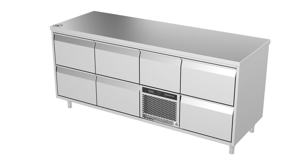 Ett fläktkylt kylsystem ger snabb nedkylning och jämn temperatur i alla lådor. Temperaturen styrs via en digital termostat och hålls stabilt mellan –5…+8 °C, även när lådorna öppnas ofta under service. Modellerna är energieffektiva i energiklass A, med upp till 45 % lägre energiförbrukning än traditionella barkylbänkar – en tydlig fördel i barer med långa öppettider. Tack vare monoblock-aggregatet sker service snabbt och enkelt: hela kylsystemet kan bytas på några minuter vid behov.