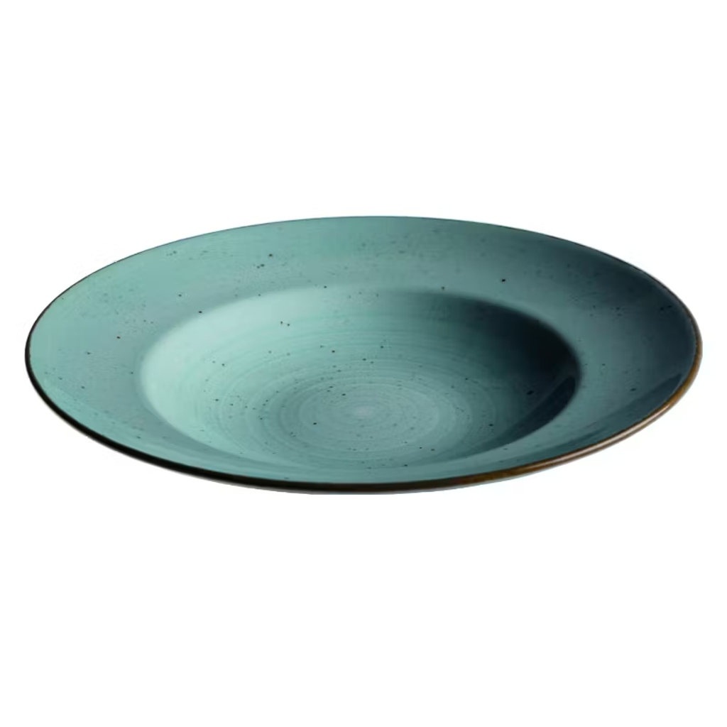 Djup handmålad pasta/salladstallrik i turkost med bruna prickar.