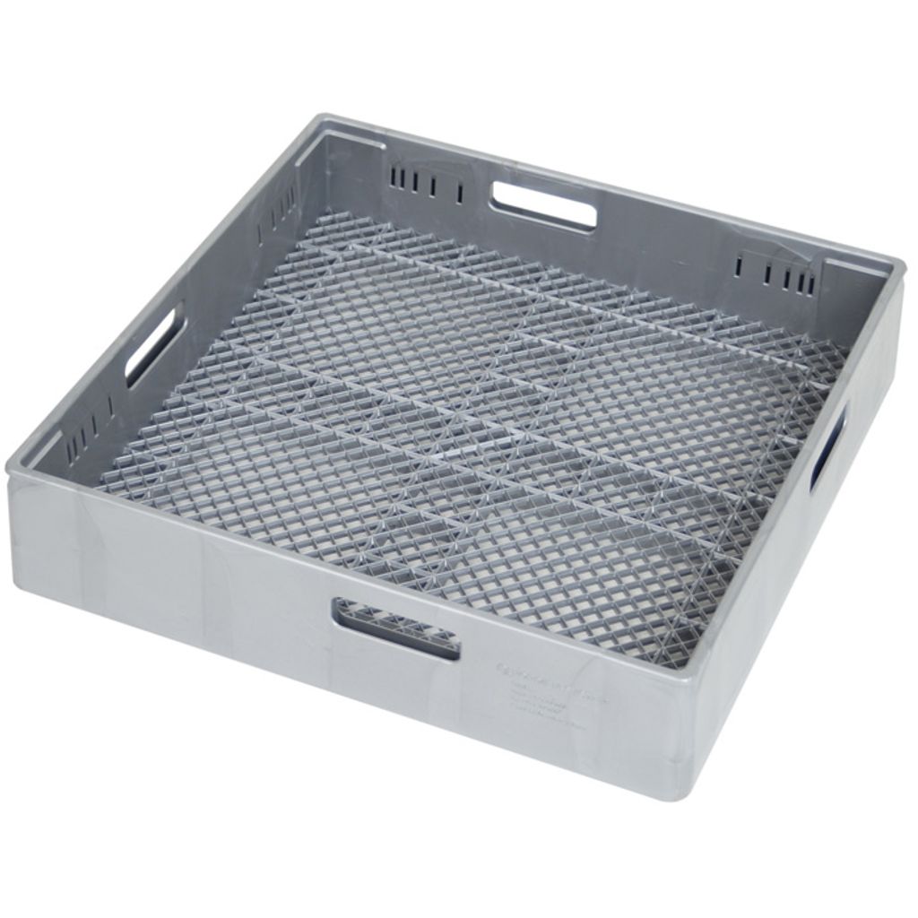Formsprutad PP-Plast, grå, staplingsbar, helt släta sidor, ergonomiskt placerade handtag diagonalt för bättre greppvänlighet och balans, finmaskig botten hindrar att besticken faller igenom, låg vikt, dubbla väggar, stabil konstruktion, stapelbar, miljöanpassade färg, passar alla på marknaden förekommande diskmaskiner för 50×50 cm diskkorgar.