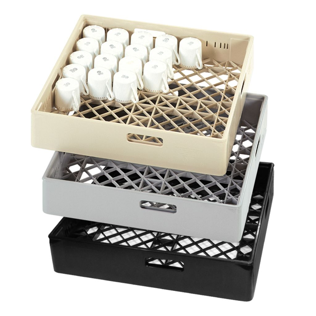 Diskkorg avsedd för diskning och lagring av koppar och glas. Tillverkad i formsprutad PP-plast i färgerna beige (010 B), grå (010 G) och svart (010 BL).