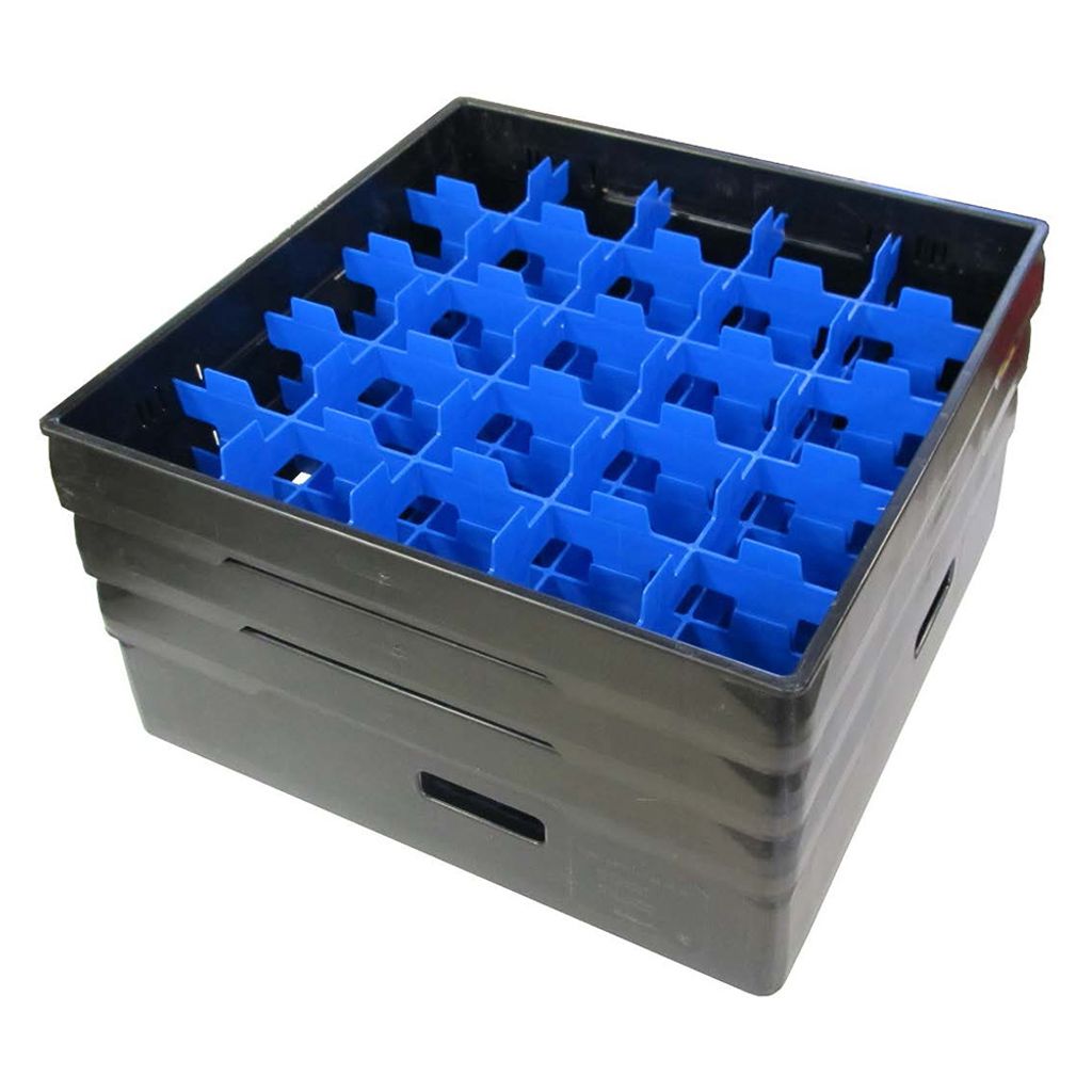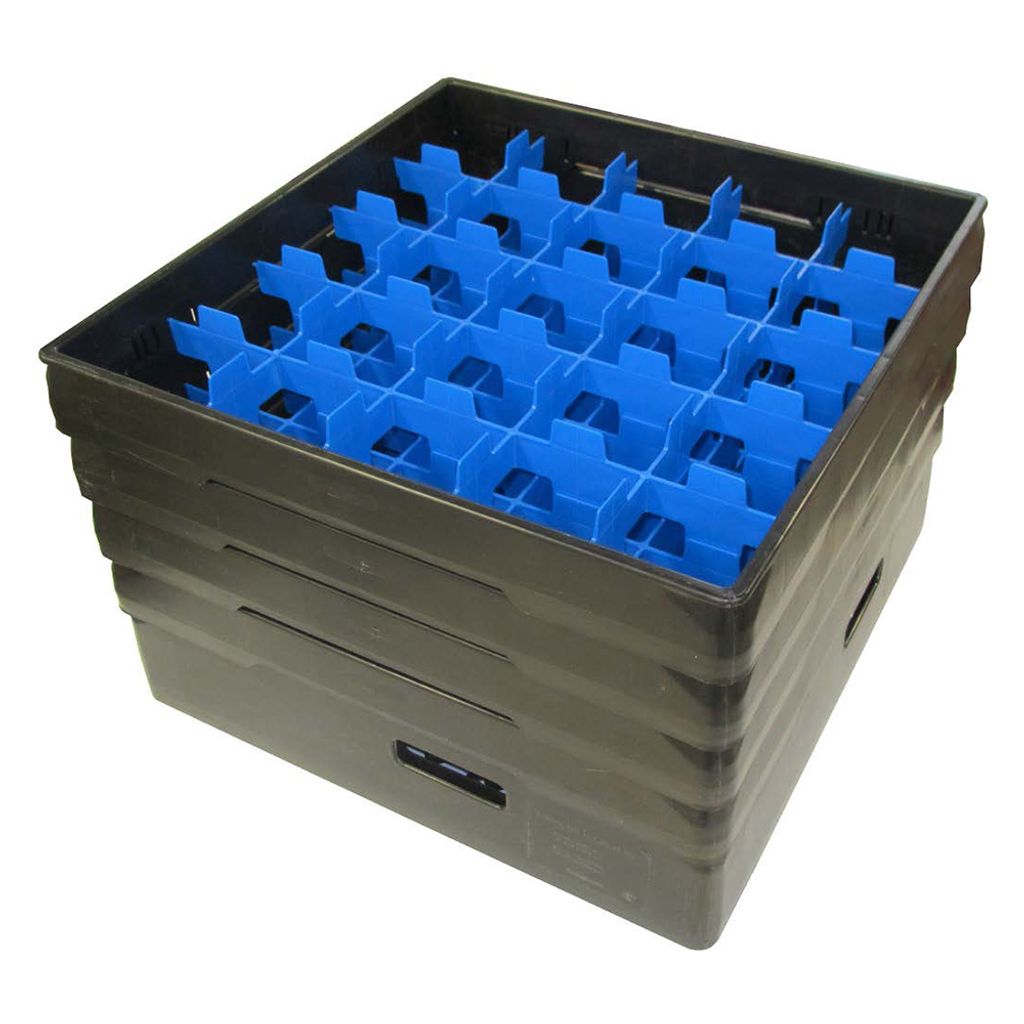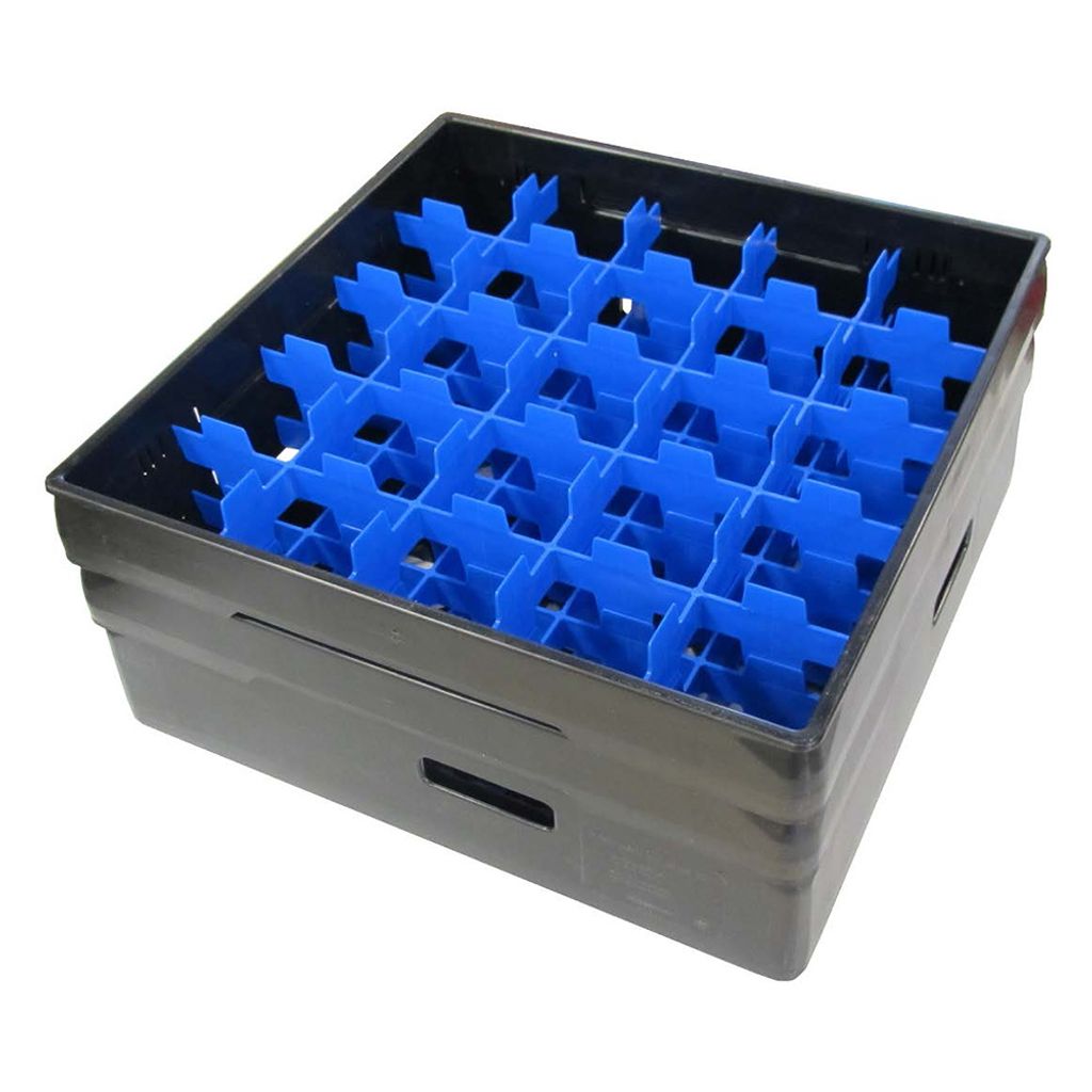 En idealisk korg för diskning, transport och lagring av glas. Glasens placering i fack förhindrar kross och slitage.