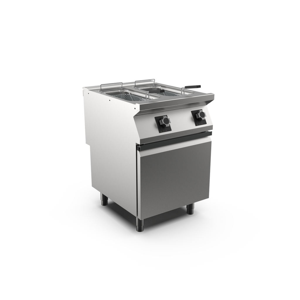 Mareno fritös FR76E10 har två bassänger på 10 liter och 9 kW effekt per bassäng. Temperaturen regleras med termostat mellan 100–185°C. Elementet kan vridas i bassängen vilket förenklar rengöring. Enheten levereras med två korgar och lock. FR76E10T har frontavtappning och FR76E10A har bottenavtappning i underskåpet.