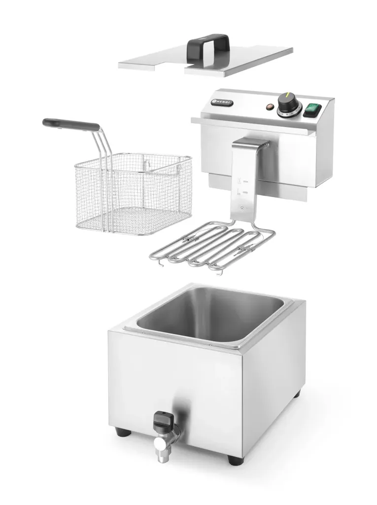 Hendi Profi Line 8 L-fritös med tappkran är en robust och professionell bordfritös för storkök. Med en kapacitet på 8 liter och en effekt på 3500 W värms den snabbt upp, samtidigt som den V-formade botten skapar en kallzon som bevarar oljans kvalitet. Tappkranen ger dig ett smidigt och rent sätt att tömma oljan utan att lyfta tunga kar. Den är tillverkad i 18/0 rostfritt stål, har en intuitiv analog ratt för temperaturkontroll, indikatorlampa och överhettningsskydd via återställningsbar säkring.