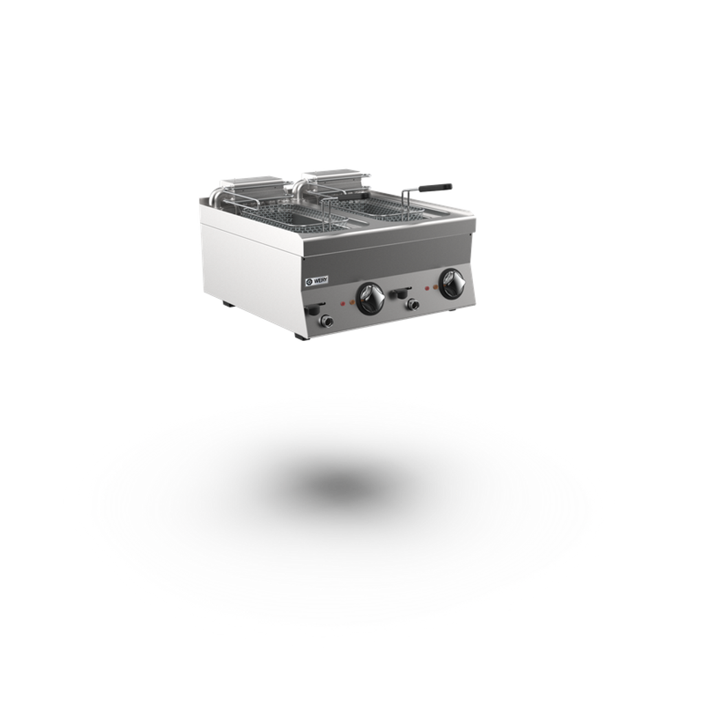 Wery elektrisk fritös FQE66R är utrustad med två 10 liters bassänger med element på 6 kW per bassäng. Enheten är termostatstyrd, temperaturen kan regleras mellan 100–180°C. Elementen kan fällas upp ur bassängen vilket förenklar rengöring. Enheten levereras med två helkorgar och lock.