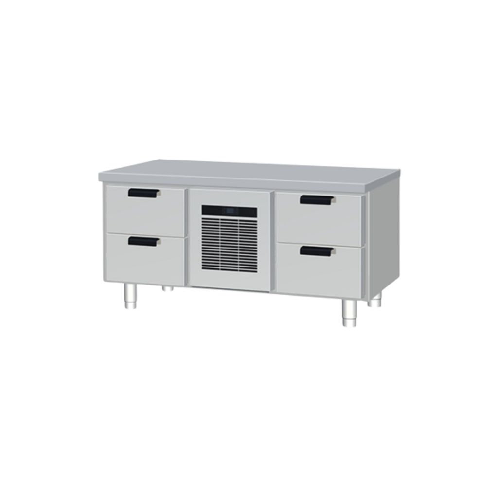 Hela bänken är tillverkad i rostfritt stål (AISI 304), ett material som tål både vardagens slitage och kraven på hygien. Kylningen är fläktkyld för jämn temperatur, och kompressorenheten sitter i en utdragbar kylkassett som gör service enkel.