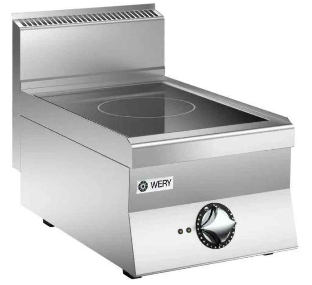 Wery induktionsspis PIE64 är mycket snabb med stor kapacitet, med verkningsgrad över 90%. Enheten har kastrullavkänning som aktiverar uppvärmningen, är energibesparande och kräver avsevärt mindre ventilation. Kokkärl skall vara avsedda för induktion och bästa effekt uppnås om ett Ø 22 cm kokkärl centreras på zonen. Spisen kokar upp 5 liter vatten på ca 5 min. Lämplig för gatukök, café och mindre restauranger.