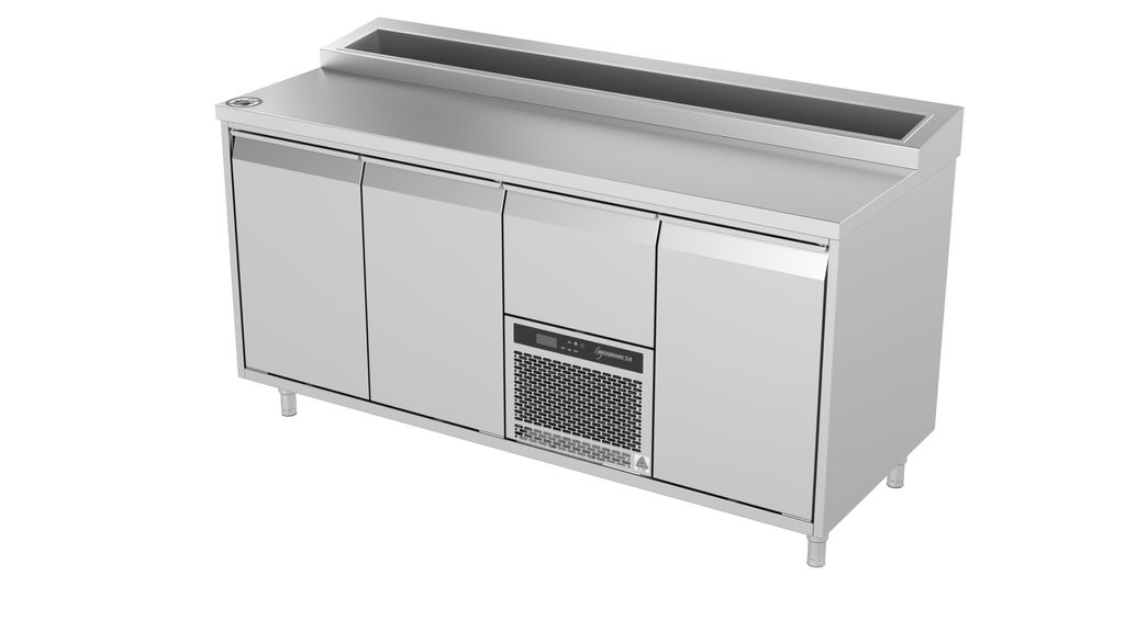 Kylningen är fläktkyld för jämn temperatur i alla fack, och det energieffektiva aggregatet håller en stabil temperatur på –5…+8 °C. Automatisk avfrostning gör att bänken fungerar utan avbrott och minimerar underhåll.