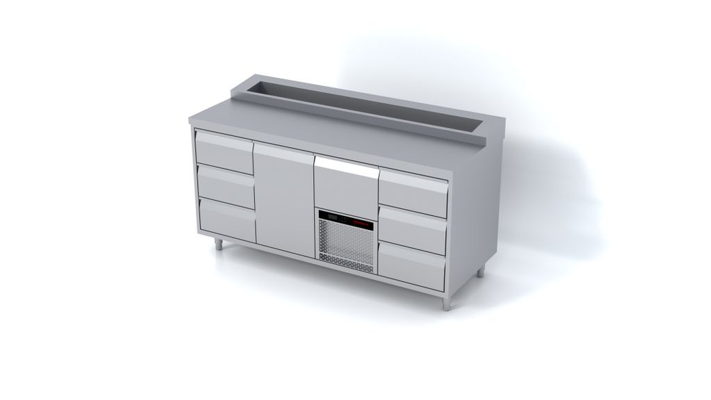 Ovanpå arbetsytan finns en integrerad och GN-anpassad kylränna, perfekt för sallader, toppingar, pålägg och alla ingredienser som måste vara både kylda och lättåtkomliga. Den rymliga arbetsytan kombineras med förvaring som kan konfigureras med dörrar, lådor eller en kombination av båda. Lådorna är 110 % utdragbara, klarar 50 kg och har separata kylzoner som gör att öppning av en låda inte påverkar temperaturen i de andra.