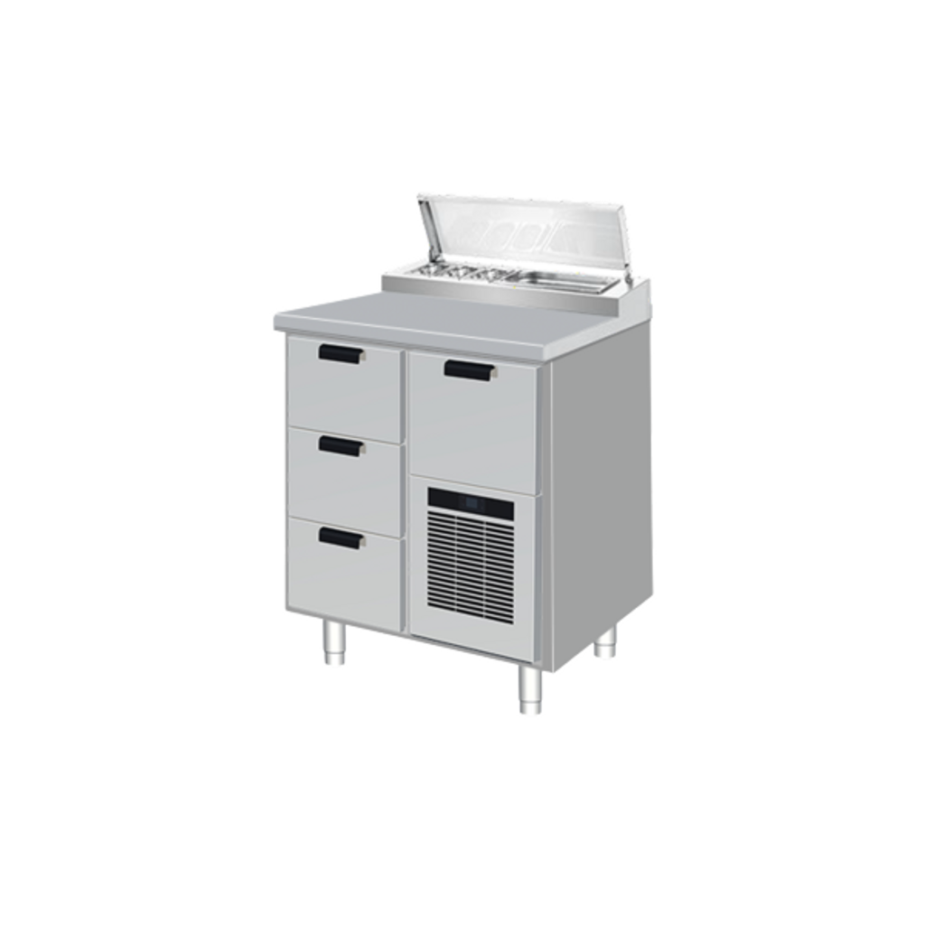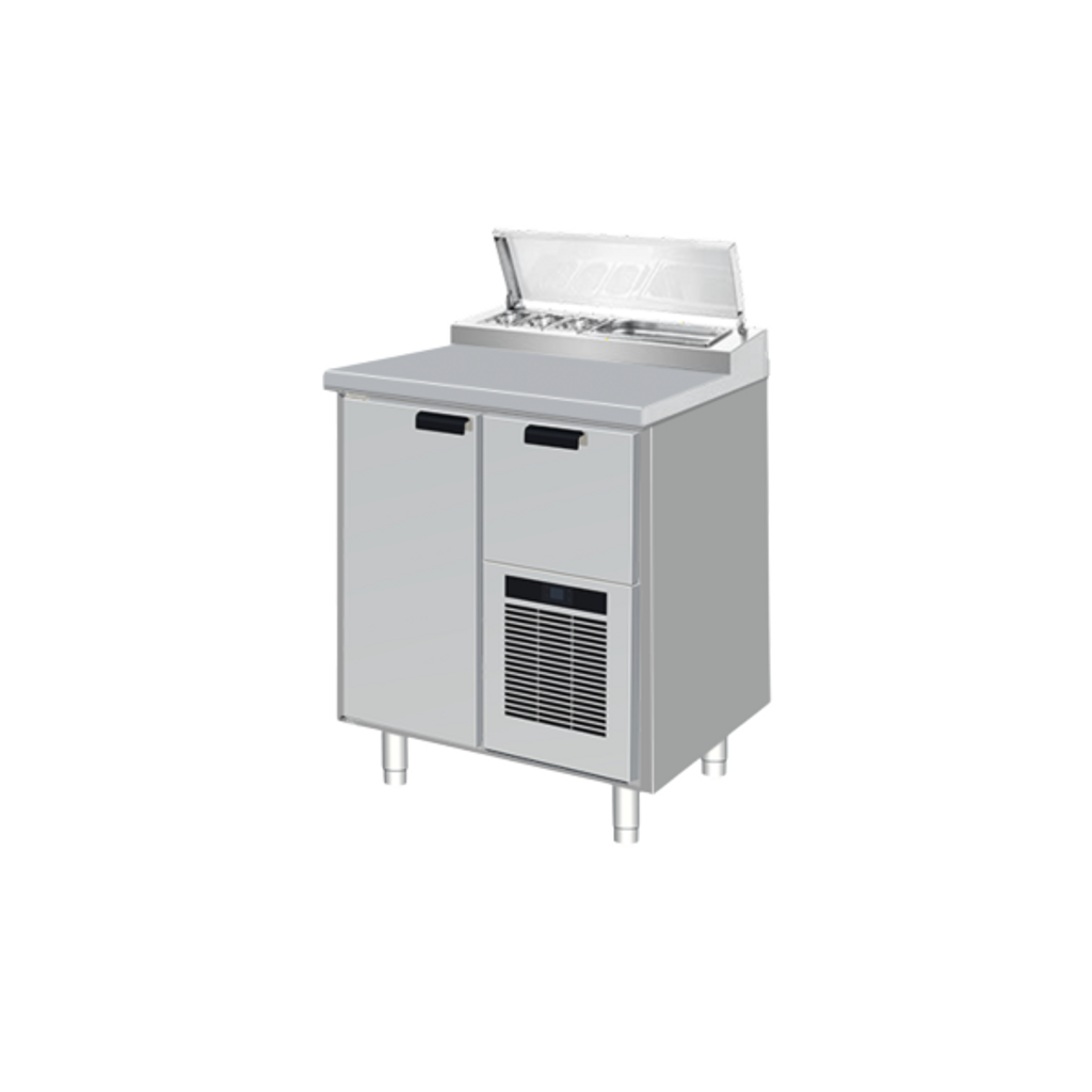 Bänken är tillverkad helt i rostfritt stål, både invändigt och utvändigt, vilket gör den tålig, hygienisk och enkel att rengöra. Ovanpå arbetsytan sitter en integrerad kylränna anpassad för Gastronorm-kantiner, där du placerar toppingar, pålägg eller sallader som ska hållas kylda men lättillgängliga.