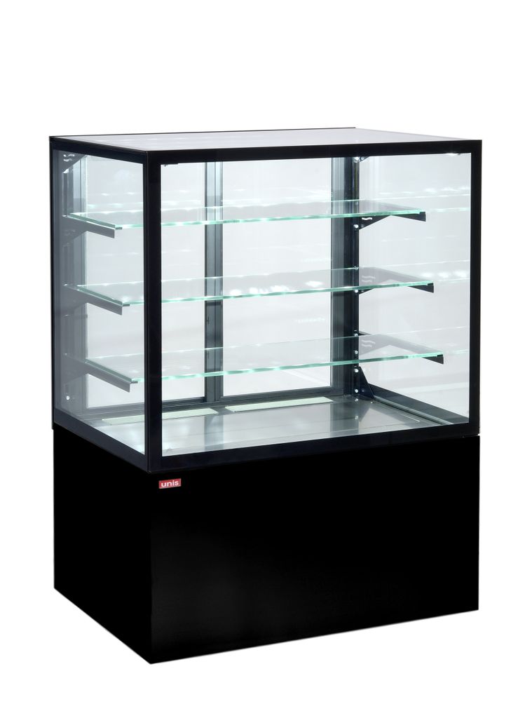 Temperaturen hålls stabil mellan +4 och +8 °C, vilket gör att både smak och konsistens bevaras som de ska. LED-belysta glashyllor framhäver färg och struktur i varje produkt utan att blända. Fronten består av rakt dubbelt isolerglas, och på baksidan finns glasskjutdörrar för enkel påfyllning. Montern är byggd i rostfritt stål, med svart överdel och grå eller svart underdel, och står stadigt på justerbara ben. Allt är gjort för att tåla vardagen i ett professionellt konditori.