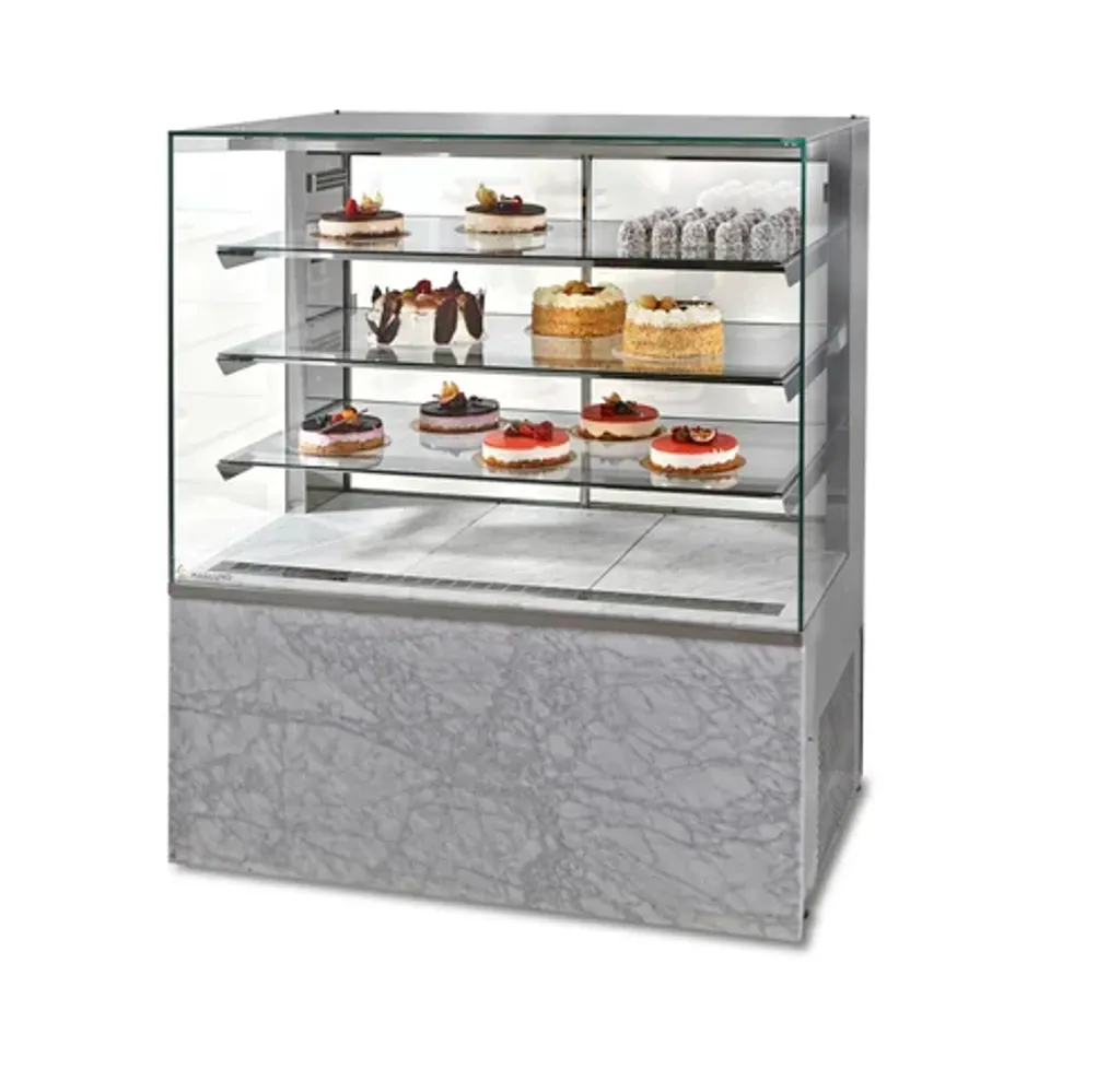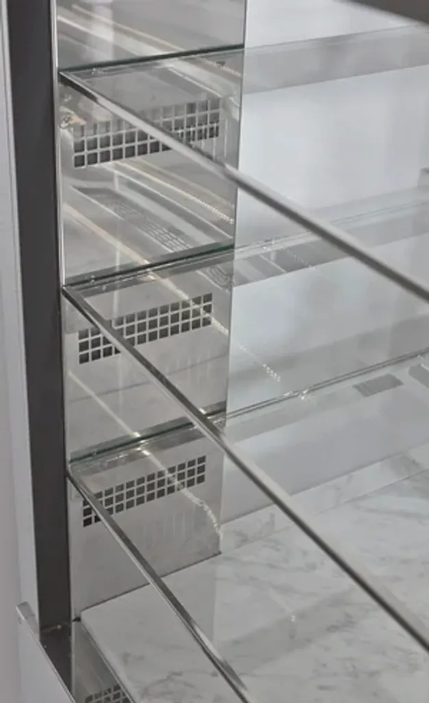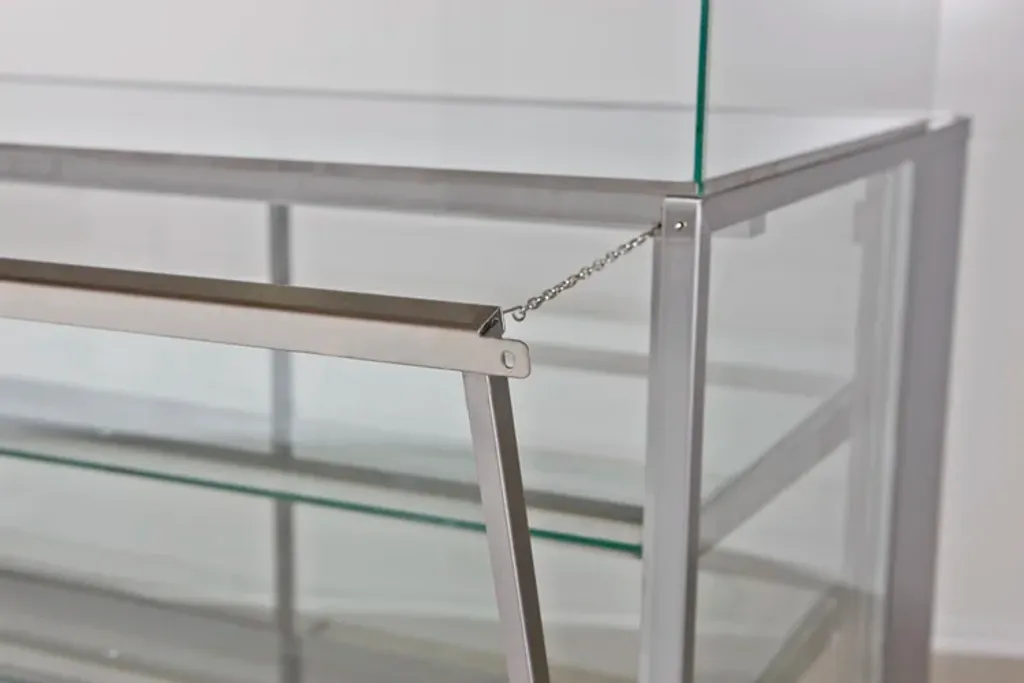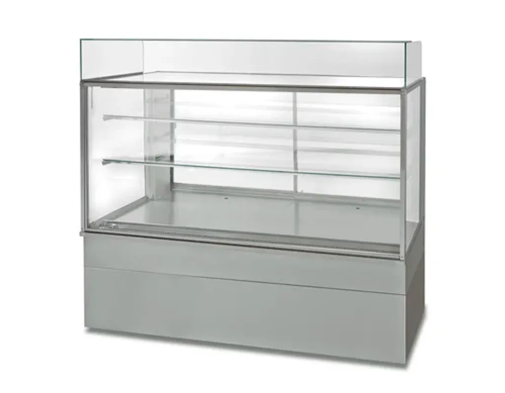 Den stängda designen med skjutdörrar på personalsidan gör det enkelt att hantera varor utan att öppna mot kund, vilket ger bättre hygien och energieffektiv drift. Displayen är byggd i rostfritt stål med isolerglas, och varje hyllplan är försett med energisnål LED-belysning som framhäver produkterna.