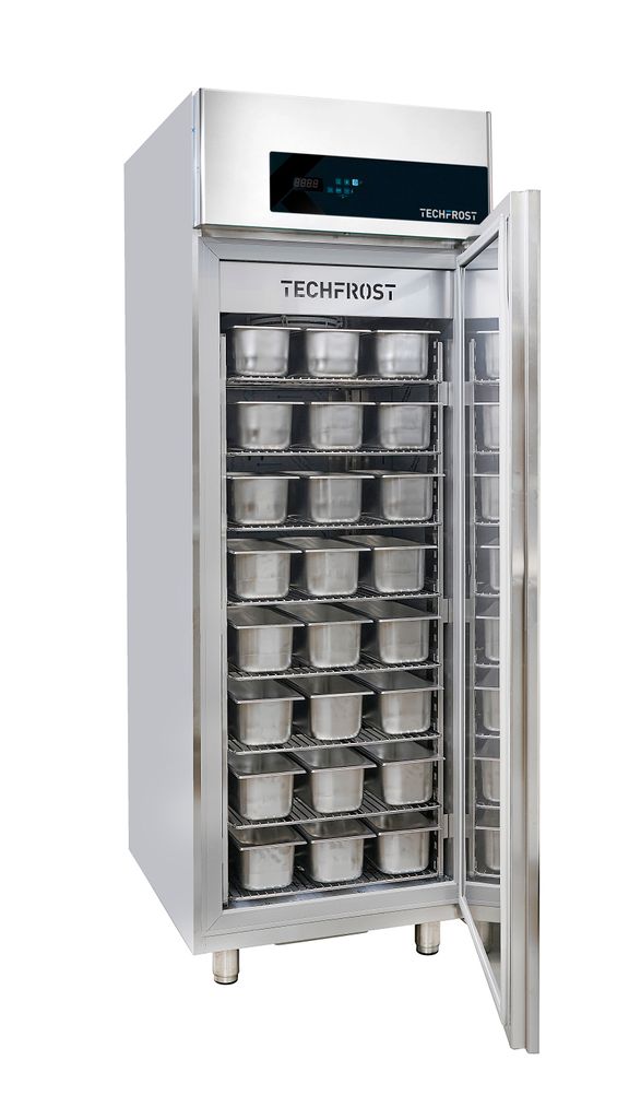 Förvaringsfrysen från Techfrost kombinerar slimmad premiumdesign i AISI 304 rostfritt stål med hög kapacitet – upp till 54 gelatokantiner och 1087 liters volym. Med indirekt luftflöde kyls glassen jämnt och skonsamt utan köldskador eller uttorkning, vilket ger bättre textur, smak och hållbarhet.