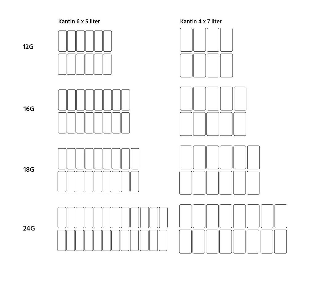 | Kantintyp Standard (smal), Gelato (bred), Pozzetti (rund) | Standard: 360 × 165 × 120 mm – 5,0 L Gelato: 360 × 250 × 80 mm – 5,0 L |