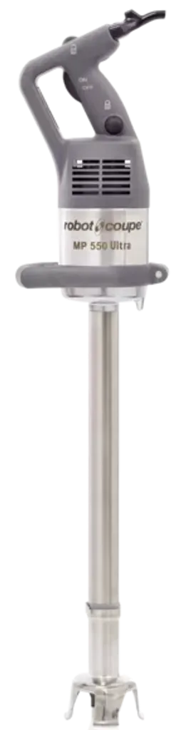 Robot Coupe MP 550 Ultra är stavmixern som mixar med extra kraft, en hastighet och proffsegenskaper i ultraklass är den byggd för kök där det händer grejer hela tiden: storkök, restaurang, catering eller caféer med högt tempo. Den tar sig an allt från varma soppor och såser till puréer, röror och dressingar – med precision, styrka och stil upp till ca 200 liter/omgång. Den är lite som den där kollegan som alltid levererar: snabb, pålitlig och svår att leva utan.