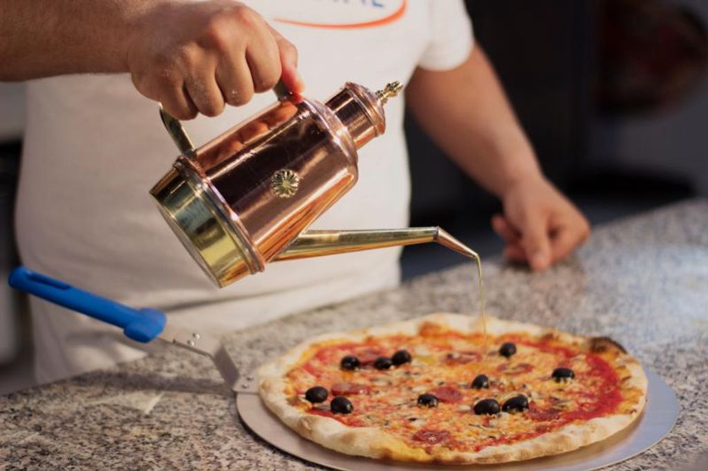 Den traditionella neapolitanska oljekannan är ett oumbärligt verktyg i det professionella pizzaköket – utvecklad för att ge exakt och jämn dosering av olja vid utbakning, topping och servering. Kannan är tillverkad i slitstarkt metallutförande med ergonomiskt grepp, anpassat för intensiv daglig användning i pizzerior, restauranger och vedugnskök. Den traditionella designen är inte bara funktionell utan också en tydlig del av den klassiska neapolitanska pizzakulturen.