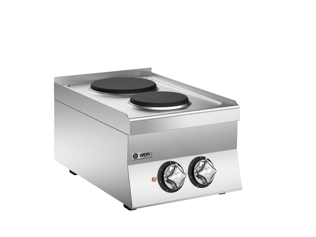Wery elektrisk spis PCE64P är utrustad med två kokplattor Ø 22 cm på 2,6 kW. Effekten för varje kokplatta regleras individuellt, i sex steg.
