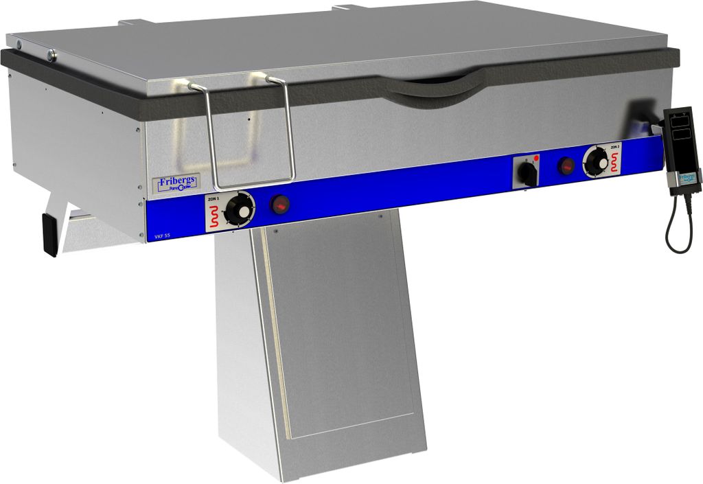 Fribergs VKF55 är ett elektriskt stekbord med en effekt på 12.6 kW och ansluts via 400 V (3‑fas), vilket ger stabil och jämn uppvärmning för professionell användning. Det har en stekyta på 720 × 550 mm med 90 mm djup, som ger gott om plats i en enda stekzon.