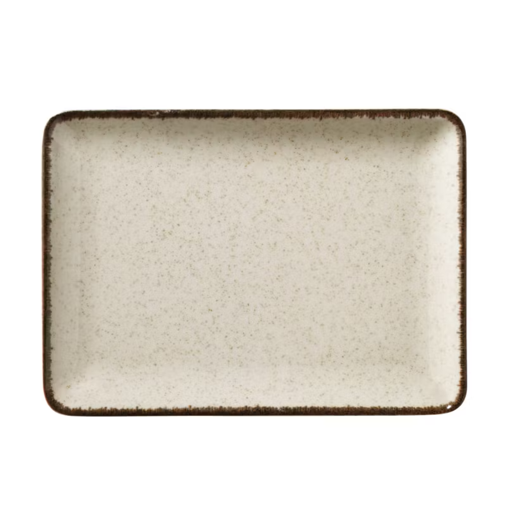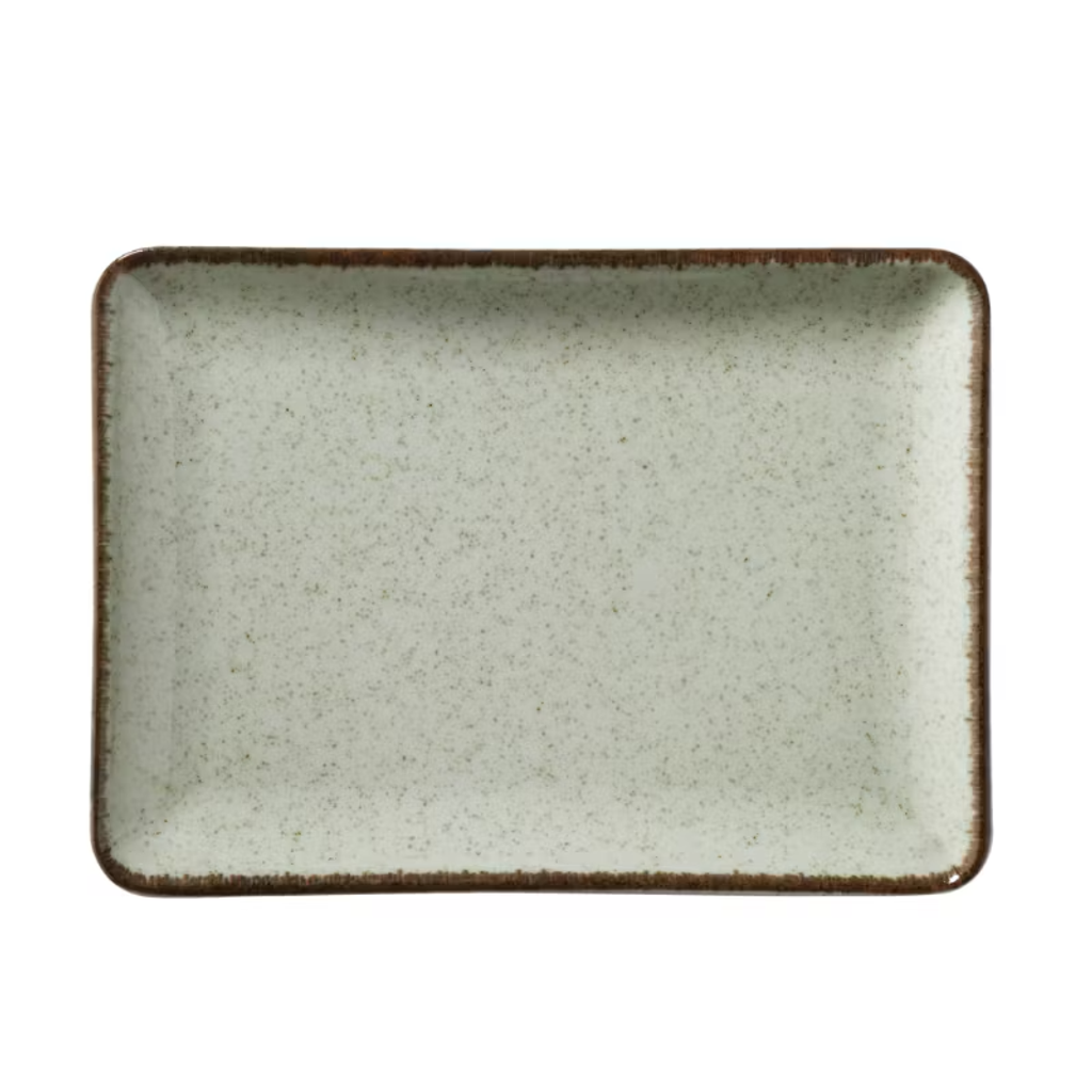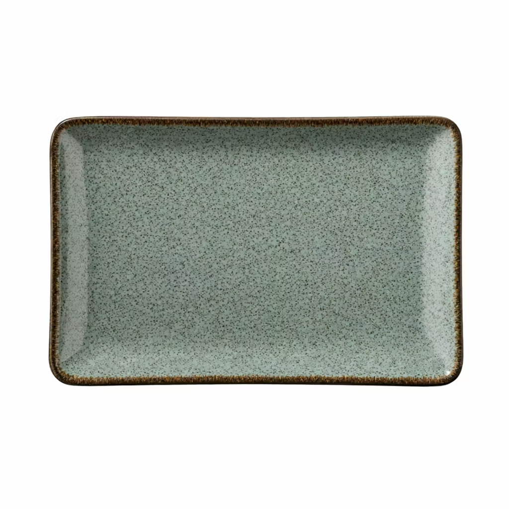 Rektangulär tallrik med sofistikerad ton i gråblå, beige eller grön. Med oregelbunden dekor som passar de flesta slags kök. Säljs i 6-pack.
