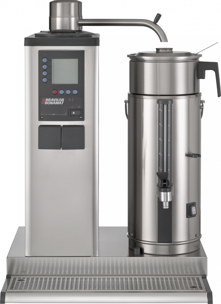 Bravilor Bonamat B10 L/R med en 5 litersbehållare är en rejäl och pålitlig filterkaffemaskin designad för dig som behöver brygga stora mängder kaffe effektivt. Den är byggd i rostfritt stål, vilket ger en robust och professionell känsla, och är utrustad med smarta funktioner som digital display, total- och dagräknare, inbyggd timer, signal när kaffet är klart samt ett avkalkningssystem som gör underhållet enklare, på 10 minuter har du 5 liter kaffe.
