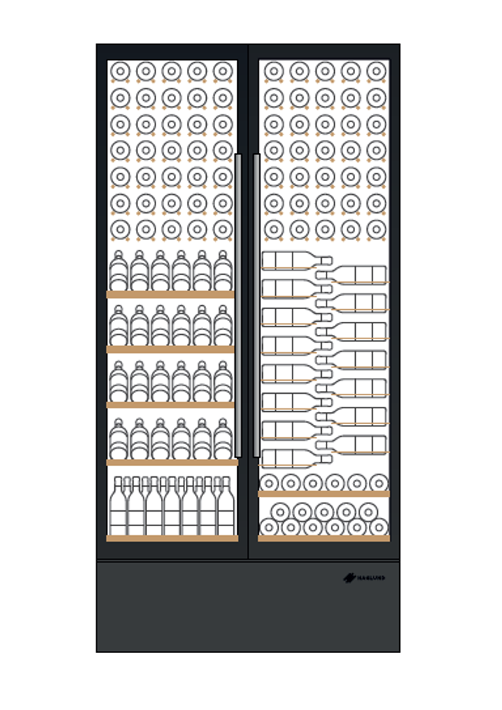 Elegant är en praktisk och stilren vinkyl som gör det enkelt att anpassa förvaring och presentation av dina viner. Med justerbara hyllplan och flera val för inredning får du en lösning som passar både olika flasktyper och din egen stil.